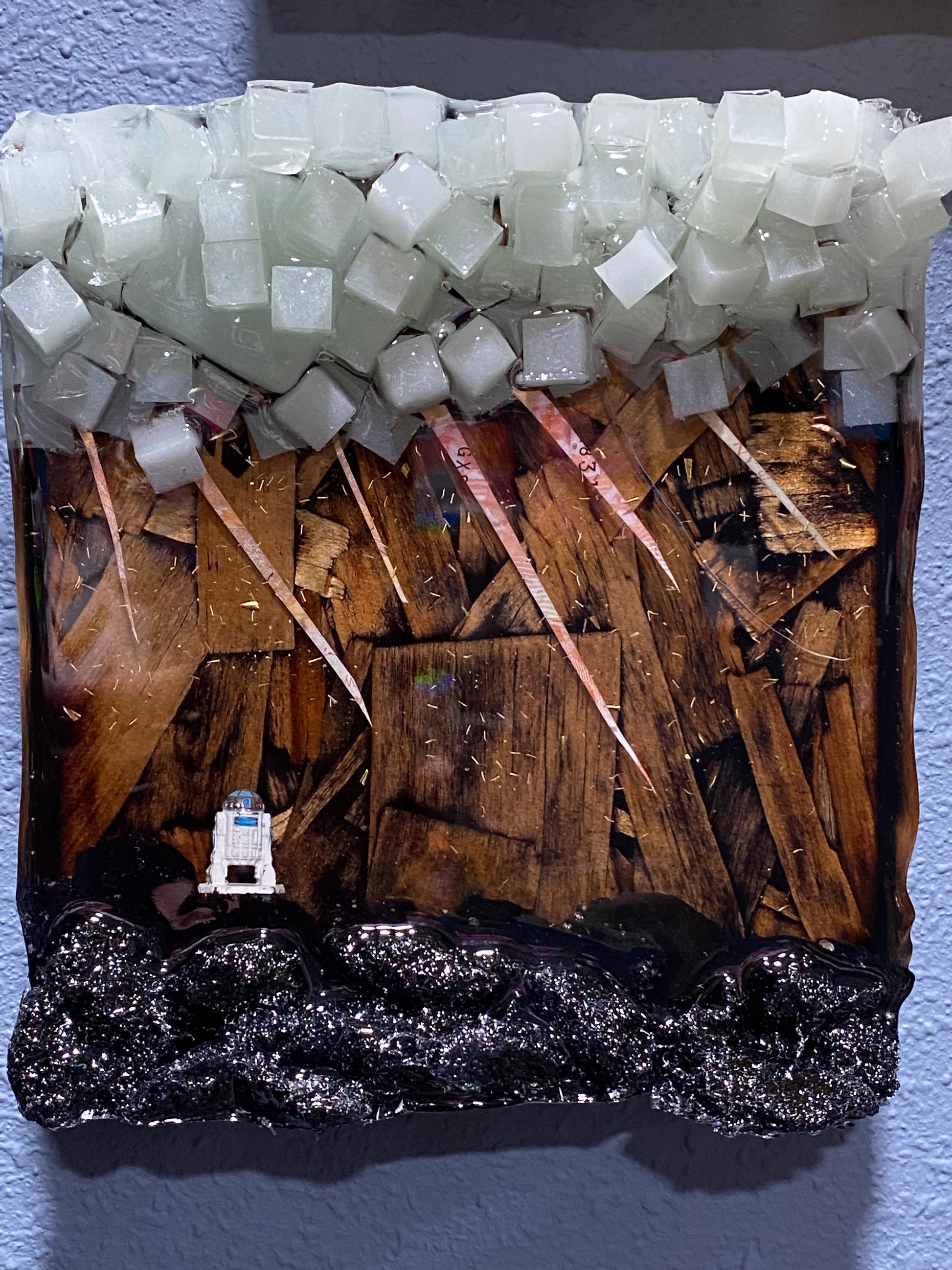 Texture, color, culture, layers, imagination, resin- all the things we love delivered in 7x7 inch squared pieces of original art by James Ardena.